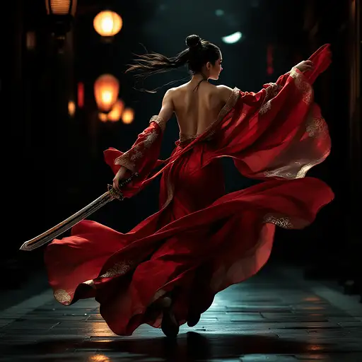 10 months ago (ancient Chinese hanfu:1.1), viewed from the side, showcasing a slim and elegant figure in a dynamic, running pose, under low light with deep shadows casting across her face, surrounded by a dark, moonlit street. The scene is enveloped in mystery with a black background, highlighting her bare back and exposed shoulders. She wears a flowing red and gold ancient Chinese skirt, the fabric catching the wind as she moves, holding an intricately designed ancient Chinese sword in one hand. The atmosphere is tense and dramatic, accentuated by the dim glow of lanterns barely piercing the darkness, 8K resolution capturing every intricate detail of the hanfu's embroidery and the sheen of the sword blade, emphasizing the sensual and slender elegance of the scene. b34dc786d87 0 27