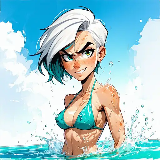 22 days ago full shot, full-length portrait, wide field of view, showing entire body, dynamic pose, ultra detailed, action pose, Caricatures pencil drawing, a girl getting out of a pool, glaring, she has short wavy white hair with teal highlights, thick eyebrows, perfect detailed hazel eyes, large breasts, with freckles on face, freckles on chest, wide hips, ), sweaty, color pencils, in the style of street caricature artist, exaggerated features, thick outlines, b356d5b16c1 0 13