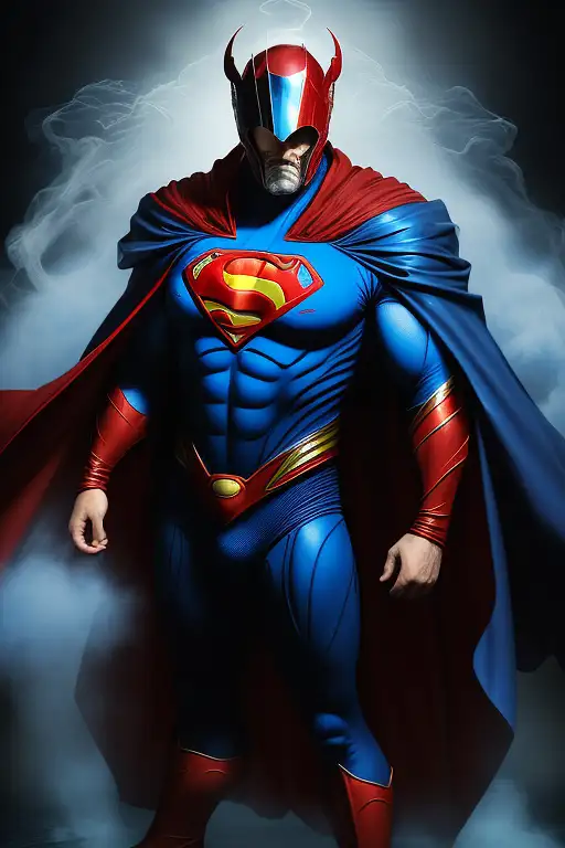 2 years ago hulk, a formidable villain,real superman costume, full body shot, wears a deep blue and red costume with intricate patterns resembling flowing smoke, high-collar cape billows dramatically, ((distinctive helmet with a rounded fishbowl-like dome)), conceals his face while housing swirling mist effects, enhance his illusionary powers b3cf0e64f69 0 28