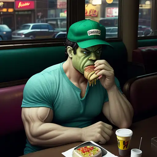 2 years ago a lonely and depressed hulk wearing a baseball cap eating a hamburger and fries beside the window in a deserted cafe diner in New York photographed by Miles Aldridge. b3cf0e64f69 0 52