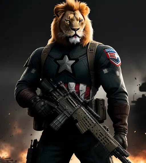 2 years ago Battle-scarred angry Captain america lion army wearing black ops uniform, holding carbine rifle, anthropomorphic, super detail, ultra hd, 8k, real life, maximum facial detail, cinematic lighting --ar 9:16 --q 2 --s 750 b3cf0e64f69 1 51