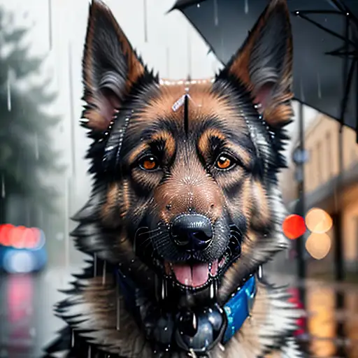 almost 2 years ago photorealistic close-up portrait of a beautiful German shepard in the rain on a street with a blurred background during a winter day. The rain should be wetting the dog , and some rain drops should be sliding down its fur and it has blue eyes. use a Nikon D850 DSLR 4k camera with a 200mm lens and an aperture of F 1.2. The scene should be made dramatic with the light from a streetlamp enveloping her. Capture the mood and emotions of the moment in this wintery and b41793e391d 1 100