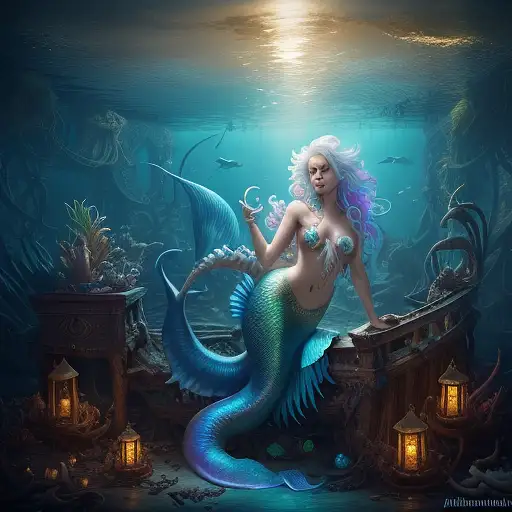 almost 2 years ago An beautiful exotic Mermaid exploring a ship wreck full of gold, billowy tail and hair, iridescent colors, colorful tropical fish, dead pirate, white tip shark, seahorses, crabs, lights creeping through rotted wet wood, mysterious and moody, Ultra photoreal, intricate details ultra details, 4k 8k olivia berardinis styling b41793e391d 1 94