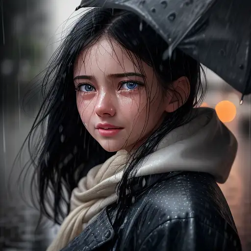almost 2 years ago (photorealistic close-up portrait of a beautiful girl crying, standing in the rain on a street with a blurred background during a winter day. The rain should be wetting her black hair, and some raindrops should be sliding down her face, She has blue eyes. use a Nikon D850 DSLR 4k camera with a 200mm lens and an aperture of F 1.2. The scene should be made dramatic with the light from a streetlamp enveloping her. Capture the mood and emotions of the moment in this wintery and b41793e391d 0 86