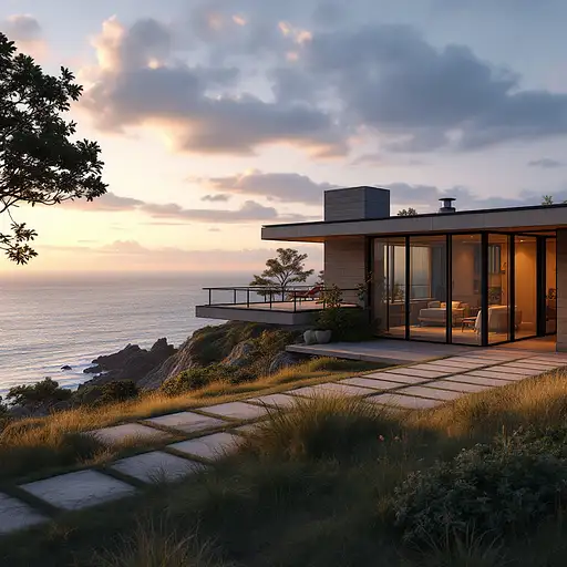 8 months ago Hyper realistic eye level exterior photo of a mid century modern style house overlooking the ocean, daylight, indirect lighting, AD magazine, Frank Lloyd, Eames, Mies van der Rohe b4b8cd3d909 0 24