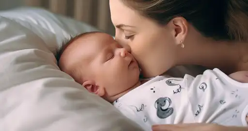 over 2 years ago a mother kissing a sleeping baby on a white bed, side view, baby wear a baby sleeping sack, in style of realistic, 8K uhd, high on detail, photography, soft light 8ca64470762 1 140