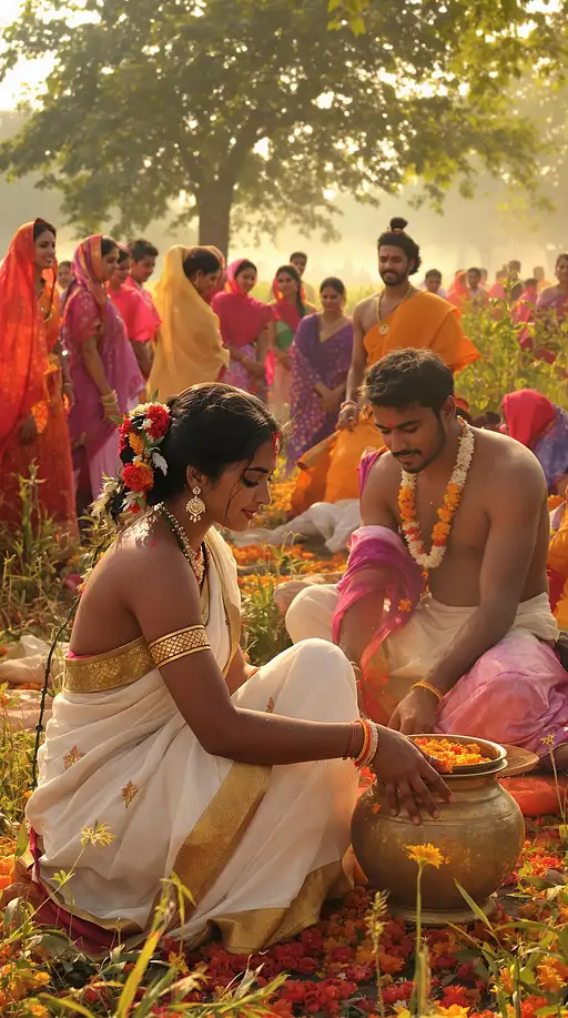 7 months ago Ultra-realistic early morning in Vrindavan, soft golden-hour sunlight filtering through mist over the Yamuna River. Radha (Indian woman in her 20s, fair skin with natural dewy texture, wearing a crisp white Banarasi silk saree with gold zari border) kneels in a meadow, collecting marigolds in a bamboo basket. Her sakhis (friends in vibrant Bandhani lehengas) laugh nearby, their dupattas fluttering. In the background, Krishna (young Indian man with warm dark-brown skin, muscular build, wearing a saffron dhoti and peacock-feather necklace) grinds crimson gulal in a brass mortar with cowherd boys. Details: Sweat on foreheads, realistic kadamba tree bark texture, distant temple spires, peacock feathers on the ground. Style: National Geographic-level realism, Canon EOS R5, f/2.8 aperture, shallow depth of field. bd7668fc968 0 26