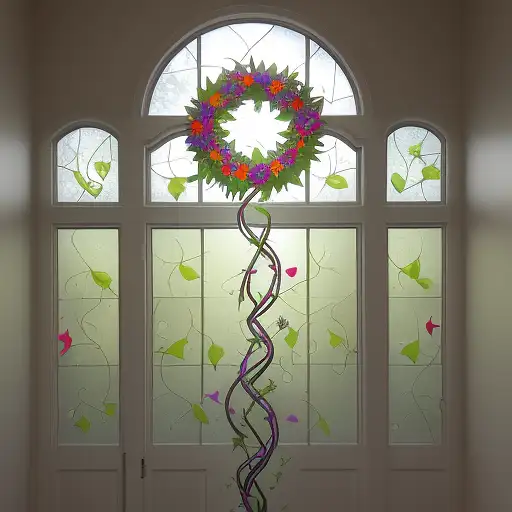 over 2 years ago 2", 4", 6", AND 12" DIAMETER CAST GLASS PETALS ATTACHED TO A METAL VINE NETWORK. THE VINES FIL A 4 FOOT WIDE BY 7 FOOT TALL FRAM SET IN FRONT OF A LARGE RECTANGULAR WINDOW. THE CAST GLASS FLOWERS ARE RANDOM VIVID RAINBOW COLORS. bgthornton 0 53