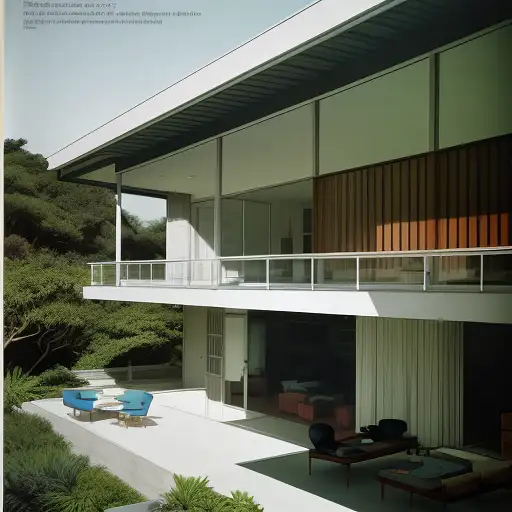 2 years ago Hyper realistic eye level exterior photo of a mid century modern style house overlooking the ocean, daylight, indirect lighting, AD magazine, Frank Lloyd, Eames, Mies van der Rohe bgthornton 0 43