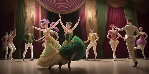2 years ago PARISIAN DANCE HALL PERFORMANCE IN THE EARLY 20TH CENTURY, INSPIRED BY MALE AND FEMALE DANCERS OF THE TIME; GLAMOROUS COSTUMES IN BEADS AND FEATHERS IN VIBRANT GREENS, GOLDS, PURPLES, AND FUCSIA MATERIALS; THE SIDE CURTAINS ARE RED VELVET WITH THE BORDER IN AN ORNATE ARCHITECTURAL PROSCENIUM ARCH AND FOOTLIGHTS SHINING ONTO THE CAST bgthornton 0 48