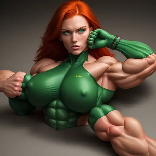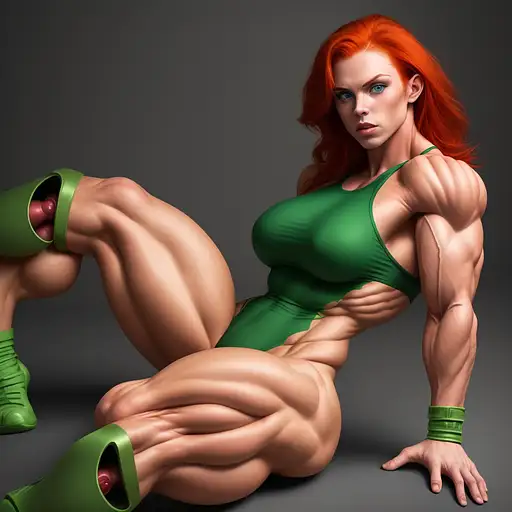 over 1 year ago 1 beautiful bodybuilder woman with a wide strong jaw, red hair, green eyes, SFW, big arms, big legs, laying down, no extra limbs, bonkman 1 160