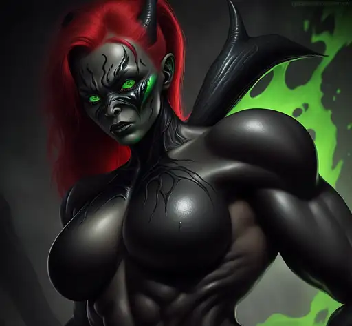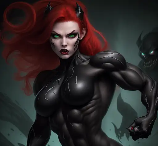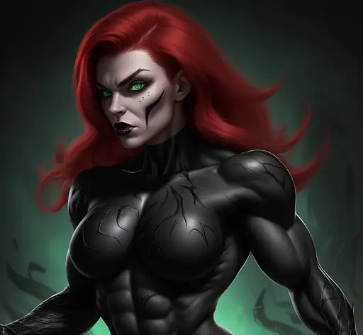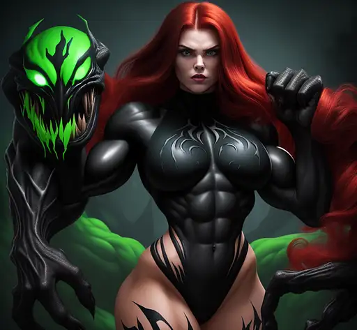 over 1 year ago 1 young beautiful bodybuilder woman with a wide strong jaw wearing a black monster symbiote, red hair, green eyes, SFW, bonkman 0 38