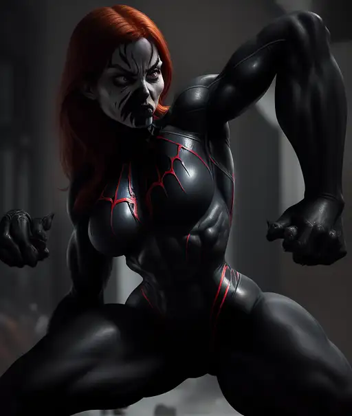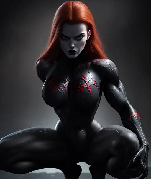 over 1 year ago 1 bodybuilder woman with a wide jaw with black lips, Mary=Jane=Watson wearing her black Spider-Man venom symbiote, muscular, red hair, clean face, feminine face, feet visible, big arms, big legs, crouching, back towards viewer, black symbiote growing from lower pelvis, bonkman 0 42