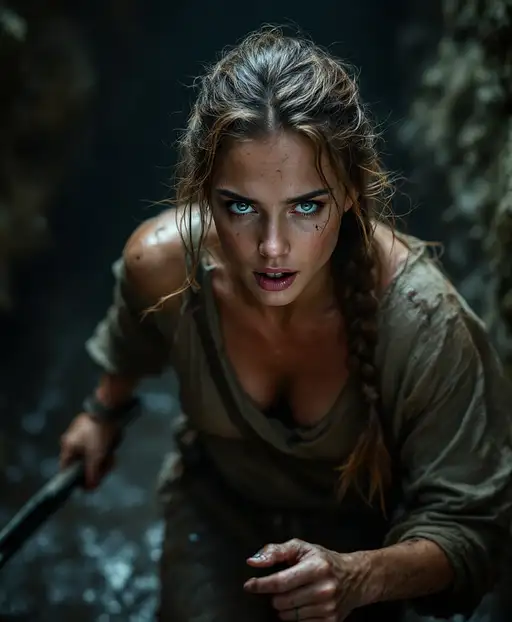 10 months ago raw realistic cinematic scene of a most beautiful young women, shar featured beautiful face wearing dirty tunic,golden brown hair in a braid, ,drentch in mud , she is holding a piece of sharp born in her hand, running in a dark, tense expression, a large dangerouse worm chasing her narrow cave , with fear,dark cinematic scene, tense moment, dramatic scene filled with thrilled,raw realistic cinematic,8k reasult,r, 8k c32f9e4ce32 0 8