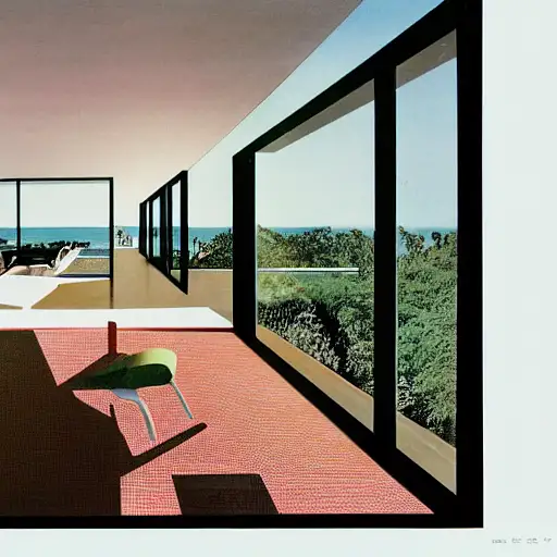 over 2 years ago hyper realistic eye level exterior photo of a mid century modern style house overlooking the ocean, daylight, indirect lighting, AD magazine, Frank Lloyd, Eames, Mies van der Rohe c3a3f7809d9 0 72