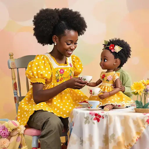 9 months ago a young black boy having a tea party with a black female doll , the dol is wearing a vibrant yellow dress with puff sleeves and white polka dots. A detachable pinafore with embroidered flowers to emphasize childlike joy. Accessorized with tiny fabric flowers in her hair. Shoes: Shiny red Mary Janes with ribbon laces. Fabric/Texture: Soft cotton and organza for a whimsical, airy feel. the background is filled with soft pastels c4782206155 0 28