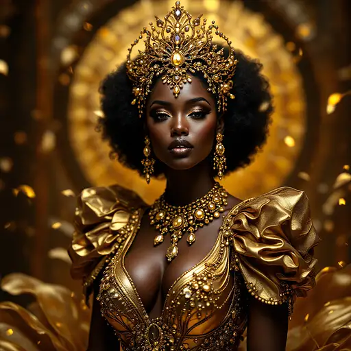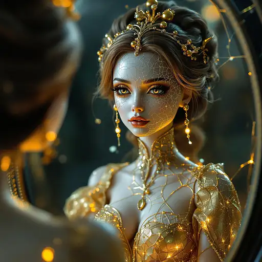 9 months ago a female doll looking in the mirror, repairing her cracked porcelain skin with golden paint (kintsugi-inspired visuals), her outfit is a dramatic golden ball gown with a cracked-glass texture and glowing accents. Her makeup features metallic highlight c4782206155 0 34