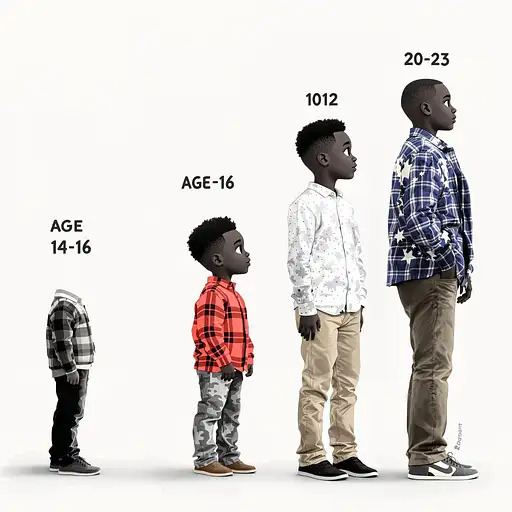 9 months ago a time progression of age, with a black boy to his adulthood, age 6-8, age 10-12, age 14-16, and 20-23 c4782206155 0 36