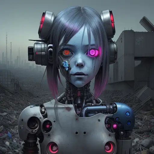 over 1 year ago Photo of a broken ruined cyborg girl in a landfill, robot, body is broken with scares and holes, half the face is android, creating a hyperpunk scene with desaturated dark red and blue details, art by Otomo Katsuhiro --ar 4:5 --s 850 --c 50 --v 6.0 c6a9ff20521 0 47