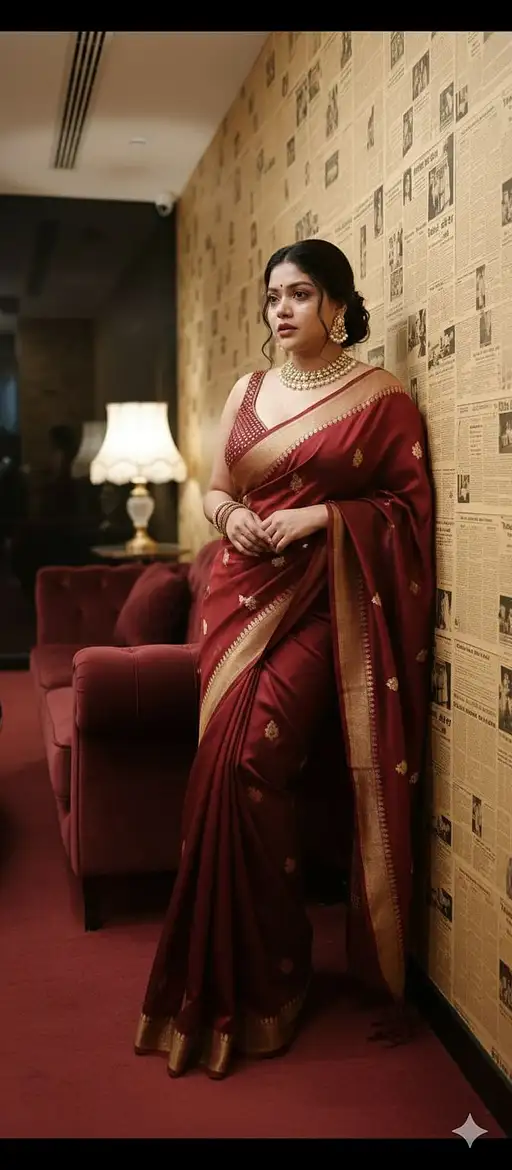 full body view of most beautiful girl as most beautiful indian realstic girl with plus size FLAT stomach , breast size 44 FF, waist 30 , hips 48 , under hips 38, most beautiful girl in elegant bold color saree and long curly hairs, hairs tied up with hair style stylishly, necklace, big wide black eyes, full face, 44F 30 48 figure, makeup, low cut neck, SLEEVLESS, LOW CUT BACK, girl embracing with emotion and possessive feeling, standing support with a wall, bitting her lips, modern elite photo room, with luxury sofa set, most beautiful girl in elegant bold color saree and long curly hairs, hairs tied up with hair style stylishly, necklace, big wide black eyes, full face, makeup, low cut neck, SLEEVLESS, DEEP CUT NECK AND BACK, girl embracing with emotion and possessive feeling, emotional crying with longing feeling, innocence and ecstasy, background, spacious modern elite photo room, with luxury sofa set, MAROON color carpet, elegant interior designs, vintage lamps, romantic reunion ambience, photorealistic, vibrant colors, intricate details, 8k.et, elegant interior designs, vintage lamps, romantic reunion ambience, photorealistic, vibrant colors, intricate details, 8k.