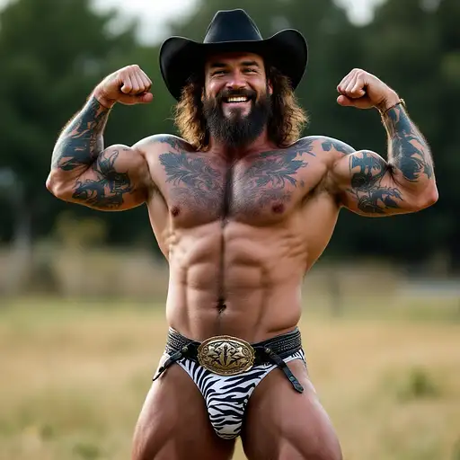 4 months ago Full body image, 28 year old Cowboy, muscular, heavily tattooed, round face, chiseled jawline, brown curly mullet hair, black cowboy hat, long low hanging narrow bulge in zebra print thong underwear, large oval rodeo belt buckle, big feet in black cowboy boots, big smile, flexing both arms, standing in grass field outside cdd0f500d69 0 13