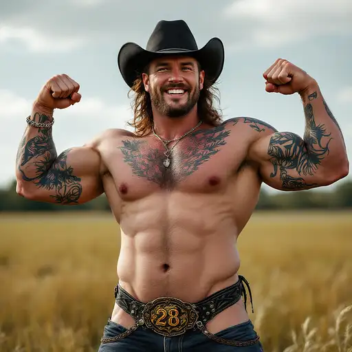 4 months ago Full body image, 28 year old Cowboy, muscular, heavily tattooed, slim face, chiseled jawline, brown curly mullet hair, black cowboy hat, long low hanging narrow bulge in zebra print thong underwear, large oval rodeo belt buckle, big feet in black cowboy boots, big smile, flexing both arms, standing in grass field outside cdd0f500d69 0 16