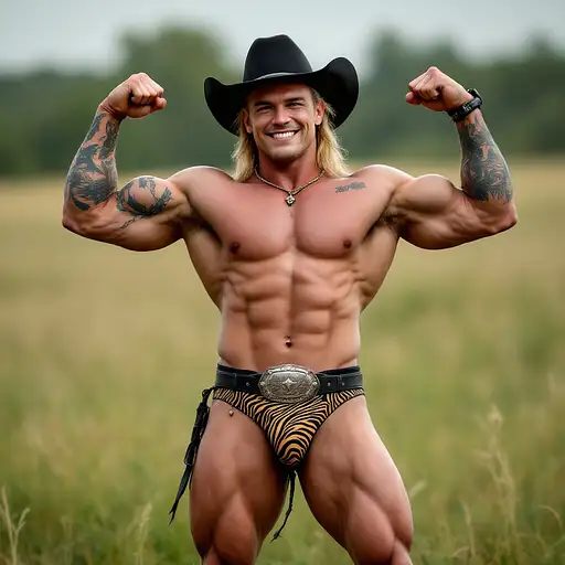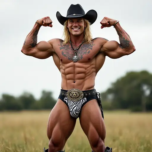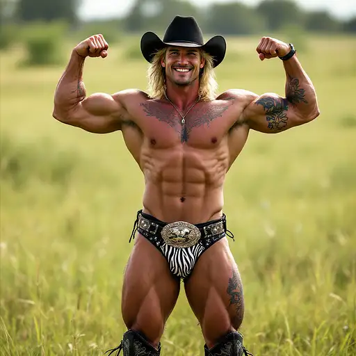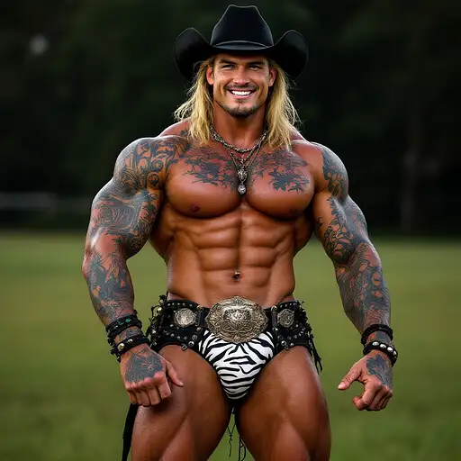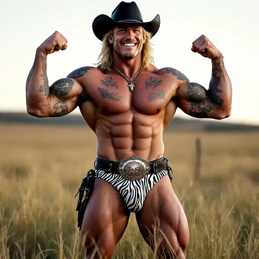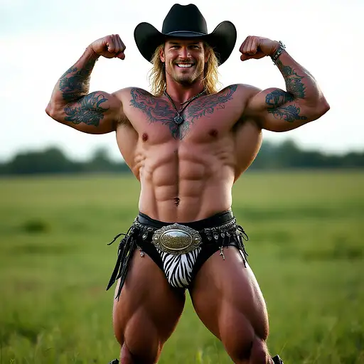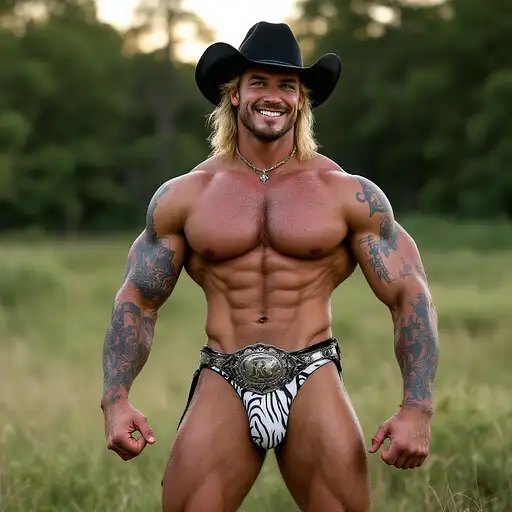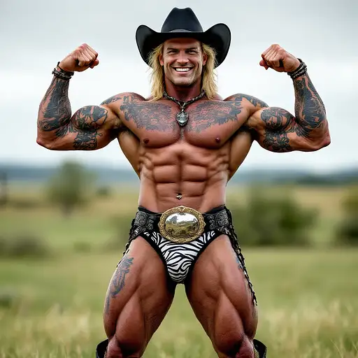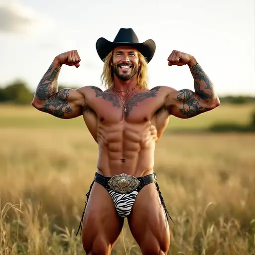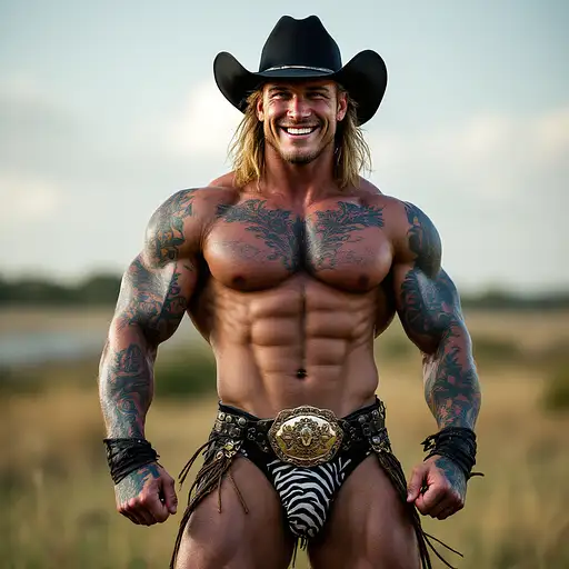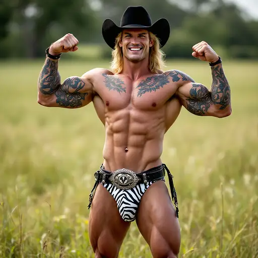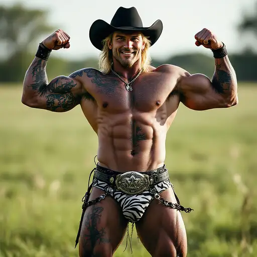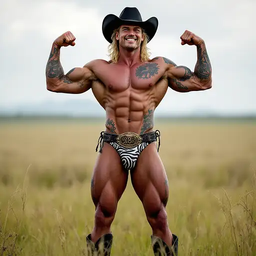 4 months ago Full body image, 28 year old Cowboy, muscular, heavily tattooed, slim face, chiseled jawline, blonde curly shoulder length mullet hair, black cowboy hat, big penis bulge in zebra print thong underwear, large oval rodeo belt buckle, big feet in black cowboy boots, big smile, flexing both arms, standing in grass field outside cdd0f500d69 0 6