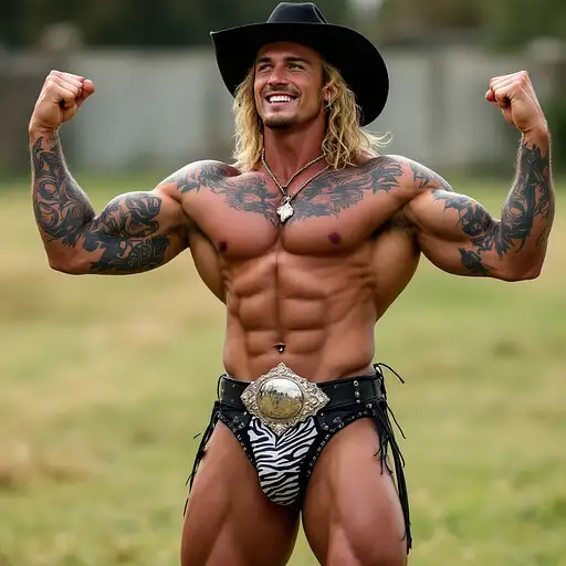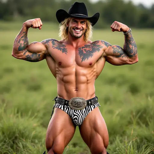 4 months ago Full body image, 28 year old Cowboy, muscular, heavily tattooed, slim face, chiseled jawline, blonde curly shoulder length mullet hair, black cowboy hat, big penis bulge in zebra print thong underwear, large oval rodeo belt buckle, big feet in black cowboy boots, big smile, flexing both arms, standing in grass field outside cdd0f500d69 0 5
