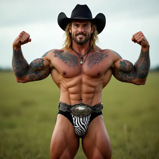 4 months ago Full body image, 28 year old Cowboy, muscular, heavily tattooed, slim face, chiseled jawline, blonde curly shoulder length mullet hair, black cowboy hat, big long penis bulge in zebra print thong underwear, large oval rodeo belt buckle, big feet in black cowboy boots, big smile, flexing both arms, standing in grass field outside cdd0f500d69 0 5
