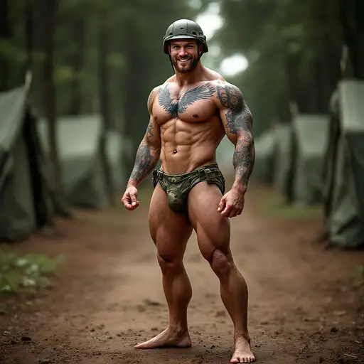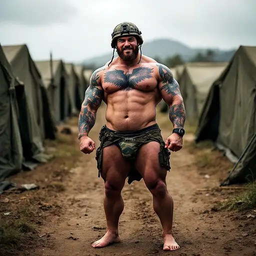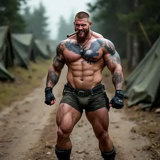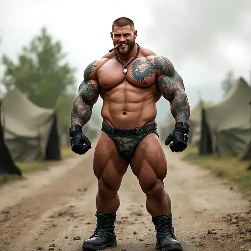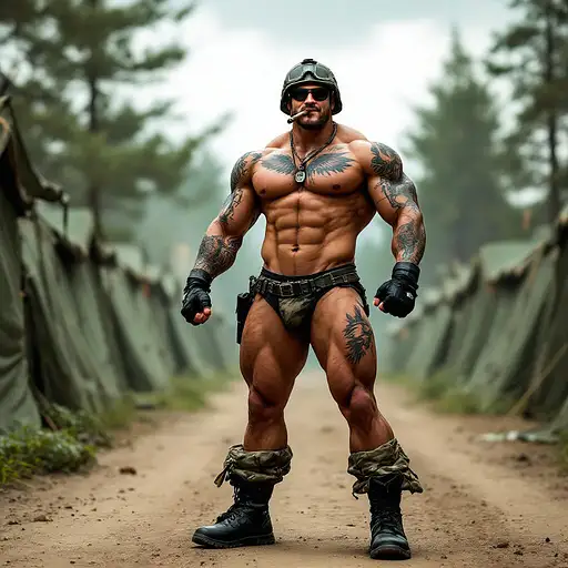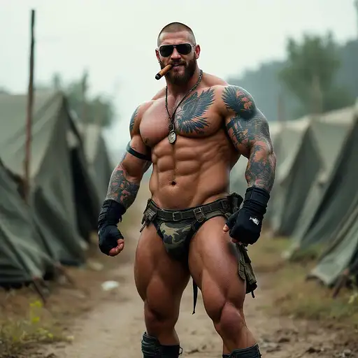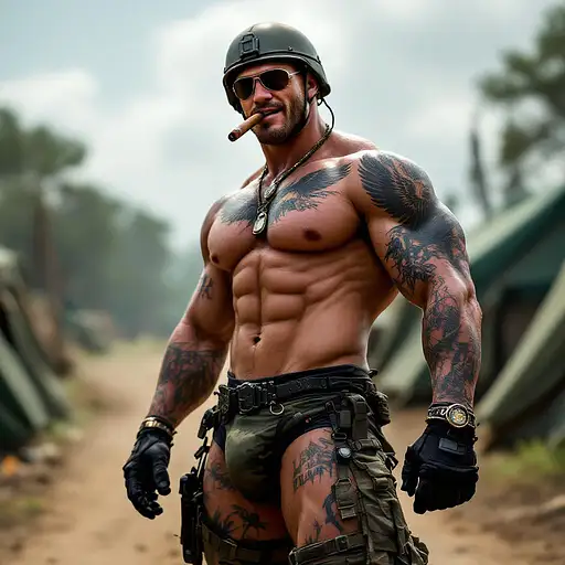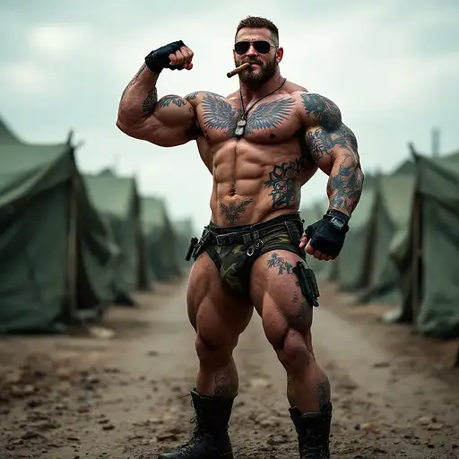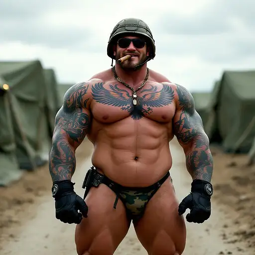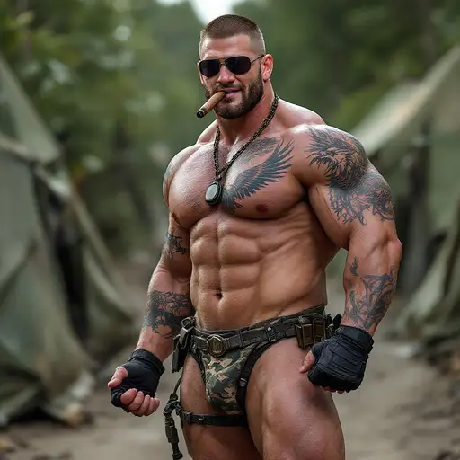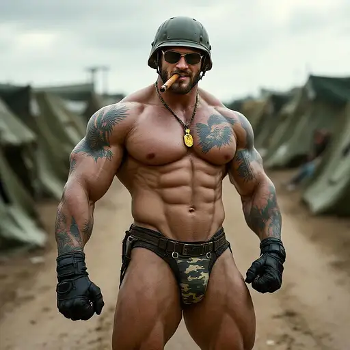 4 months ago Chris Redfield, Full body image, looking at us, shirtless, muscular abs, lots of tattoos, eagle chest tattoo, dog tags, aviator sunglasses, big cigar in mouth, black fingerless gloves, big long penis bulge in camouflage thong underwear, army helmet, big feet in black combat boots, standing on dirt road with army green tents, flexing one bicep, grinning cdd0f500d69 0 6