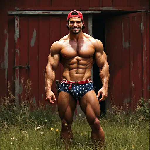 4 months ago Nathan Drake, Full body image, looking at us, shirtless, muscular abs, big penis bulge in stars and stripes thong underwear, red backwards baseball hat, big bare feet, standing in grass by red barn, flexing one bicep, grinning cdd0f500d69 0 7