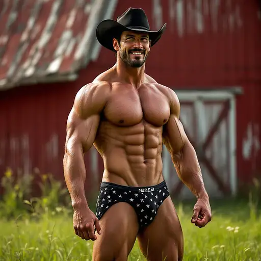 4 months ago Nathan Drake, Full body image, looking at us, shirtless, muscular abs, big penis bulge in stars and stripes thong underwear, black cowboy hat, big bare feet, standing in grass by red barn, flexing one bicep, grinning cdd0f500d69 0 9