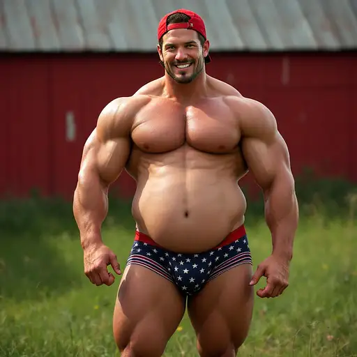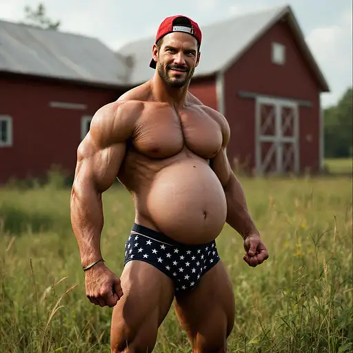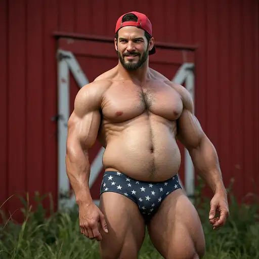 4 months ago Nathan Drake, Full body image, looking at us, shirtless, muscular abs, big crotch bulge in stars and stripes boxer briefs underwear, red backwards baseball hat, big bare feet, standing in grass by red barn, flexing one bicep, grinning cdd0f500d69 0 9