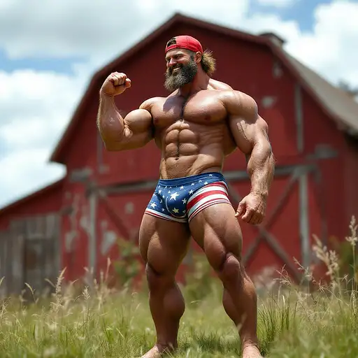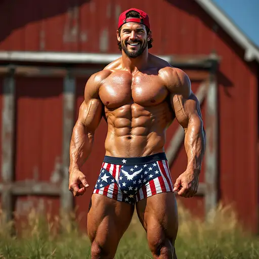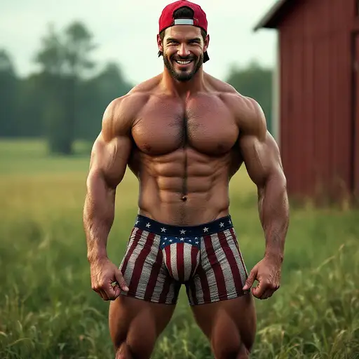 4 months ago Nathan Drake, Full body image, looking at us, shirtless, muscular, big crotch bulge in stars and stripes boxer briefs underwear, red backwards baseball hat, big bare feet, standing in grass by red barn, flexing one bicep, grinning cdd0f500d69 0 4