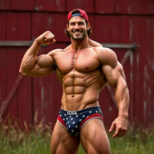 4 months ago Nathan Drake, Full body image, looking at us, shirtless, muscular abs, big penis bulge in stars and stripes thong underwear, red backwards baseball hat, big bare feet, standing in grass by red barn, flexing one bicep, grinning cdd0f500d69 0 12