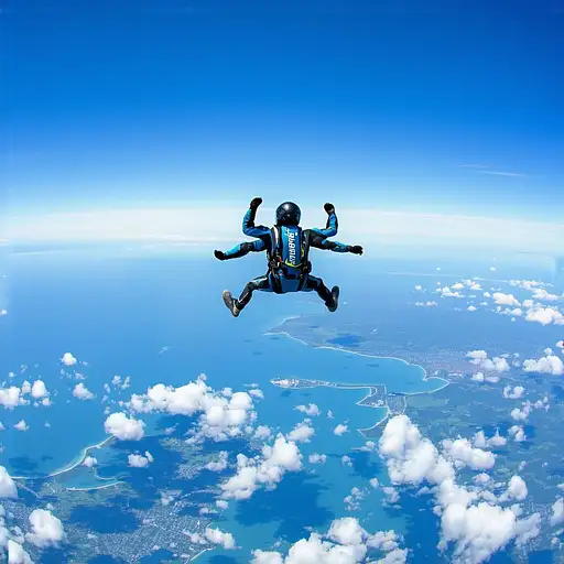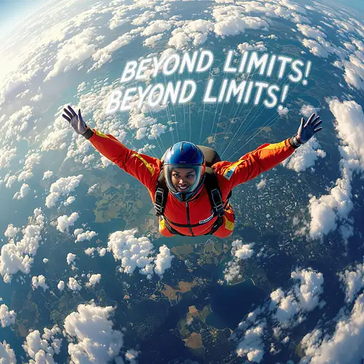 Craft Generate an exhilarating and inspirational image of a skydiver mid-free-fall, embodying the spirit of adventure and pushing personal boundaries. The image should be visually dynamic and filled with energy. Refine The skydiver should be captured in a dramatic pose, arms spread wide, fully embracing the thrill of the descent. Their jumpsuit should be vibrant and high-performance, with visible details such as harness straps and parachute equipment. Motion effects should enhance the sense of speed, with wind and sky rushing past. Below, the Earth should stretch out in breathtaking detail, with a mix of oceans, green landscapes, and scattered clouds creating a striking aerial perspective. The lighting should be natural, with the sun casting a warm glow over the skydiver and surroundings. The phrase "Beyond Limits!" should be integrated seamlessly into the scene. It could appear as bold, futuristic typography trailing behind the skydiver, or be naturally formed by wispy white clouds in the sky. The text should feel like an organic part of the composition, not an overlay. Evaluate Ensure that the image captures a true sense of adrenaline and limitless potential. The skydiver should be the focal point, with strong contrast between their suit and the background for visual clarity. The text should be positioned naturally, enhancing rather than distracting from the overall composition. Adapt This image is intended for motivational campaigns, extreme sports branding, and adventure-themed media. It should be high resolution and professionally composed for marketing and promotional use. Test Try different perspectives, such as a first-person point of view (POV) from the skydiver’s helmet cam or a distant third-person view capturing the vastness of the sky. Experiment with alternative ways to integrate text, such as light trails or skywriting effects. Execute Generate a breathtaking, high-resolution image of a skydiver in free fall, arms outstretched, with the phrase "Beyond Limits!" dynamically incorporated into the sky. The scene should evoke adventure, courage, and pushing past boundaries.