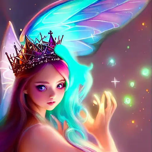 3 years ago Gorgeous fairy girl wearing crown with long neon hair, two wings and a villain's smile, cute red cheeks, unreal engine, highly detailed, artgerm digital illustration, studio ghibli, deviantart, sharp focus, artstation, by Alexei Vinogradov bakery, sparkles, gorgeous, emerald eyes, sparkled, 8 k cf4145ee7b9 1 250