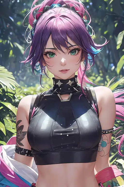 (ultra high res,photorealistic,realistic,best quality,photo-realistic), (8k, raw photo, best quality, masterpiece), ((nsfw)), (photon mapping, radiosity, physically-based rendering,automatic white balance), technological sense, best quality, masterpiece, illustration,CG ,unity ,wallpaper, official art, Amazing, finely detail, an extremely delicate and beautiful,extremely detailed, highly detailed, sharp focus,rich background,blurry background, (real person,photograph), (((high detailed skin,visible pores))), ((small breasts)), Her hair is a riot of colors, from hot pink to electric blue to neon green, styled in wild spikes that defy gravity. Her eyes are a bright, sparkling green, full of energy and excitement. Her lips are painted black, a stark contrast to the vibrant hues of her hair and eyes. She wears a sleeveless crop top, the fabric printed with a kaleidoscope of patterns and colors, and a studded leather choker that draws attention to her neck. Her shoulders and arms are covered in tattoos, each one a unique work of art.
