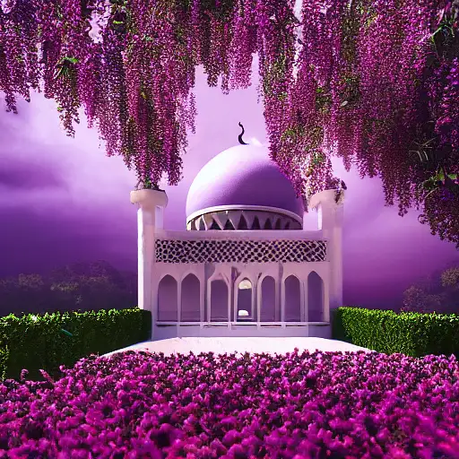 almost 3 years ago < Garden mosque, Many small flowers,A few black roses,fogs, red clouds above, violet, dreamy ultra wide shot, atmospheric, hyper realistic, 8k, epic composition, cinematic, octane render, artstation landscape vista photography by Carr Clifton cff57d0cced 0 81
