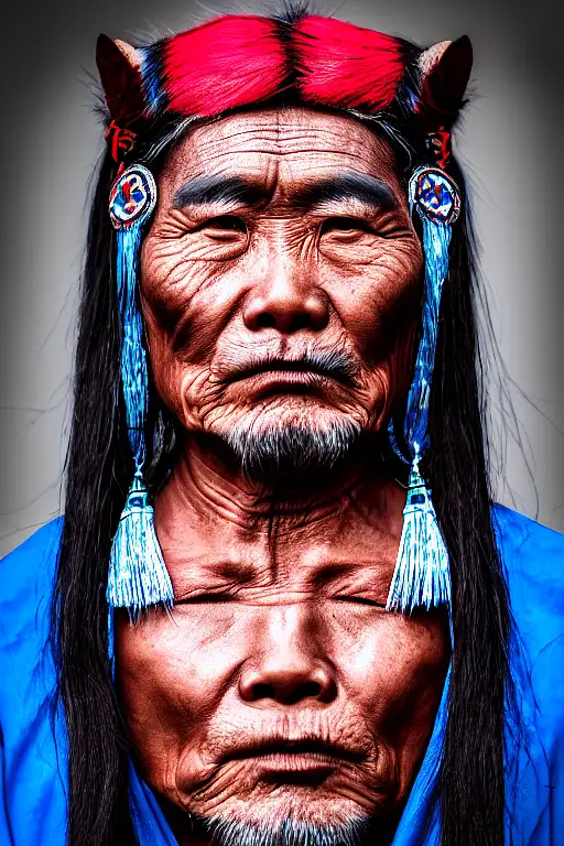 almost 3 years ago portrait photo of a asia old warrior chief, tribal panther make up, blue on red, side profile, looking away, serious eyes, 50mm portrait photography, hard rim lighting photography--beta --ar 2:3 --beta --upbeta cff57d0cced 1 130
