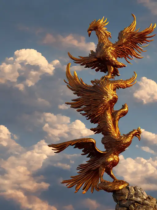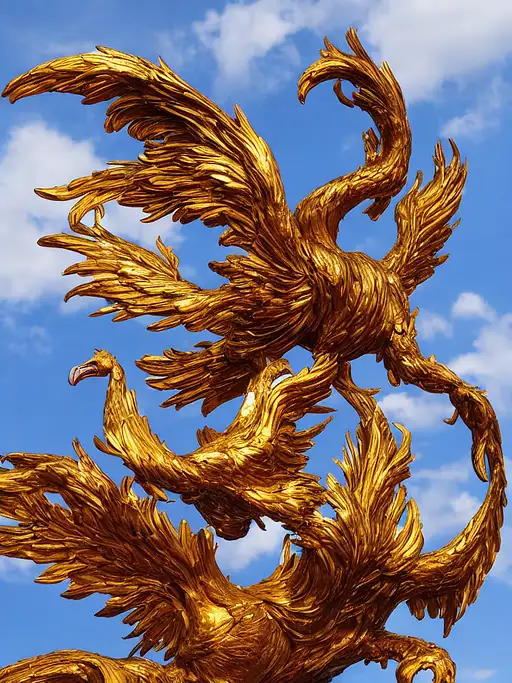 2 years ago A majestic phoenix with vibrant plumage, its fiery wings spread wide, golden feathers illuminating against a dark sky, perched atop a rugged mountain peak, surrounded by swirling clouds, capturing the phoenix's grace and intensity, Sculpture, bronze casting, 8k high definition --ar 1:1 --v 5 cr4shband1coot 0 62