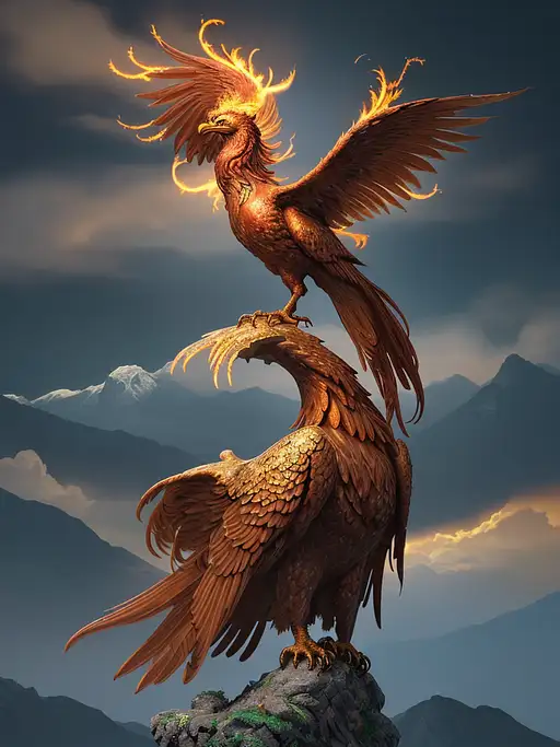 2 years ago A majestic phoenix with vibrant plumage, its fiery wings spread wide, golden feathers illuminating against a dark sky, perched atop a rugged mountain peak, surrounded by swirling clouds, capturing the phoenix's grace and intensity, Sculpture, bronze casting, 8k high definition --ar 1:1 --v 5 cr4shband1coot 0 63