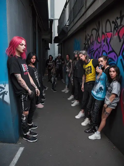 2 years ago A rebellious street gang gathered under a flickering streetlight in a dark alley, their faces partially hidden by shadows, graffiti-covered walls surrounding them, showcasing their edgy and urban aesthetic. Painting, using acrylic paints on canvas, with a focus on bold lines and vibrant colors to bring out the energy of the scene, --ar 9:16 --v 5 cr4shband1coot 0 45