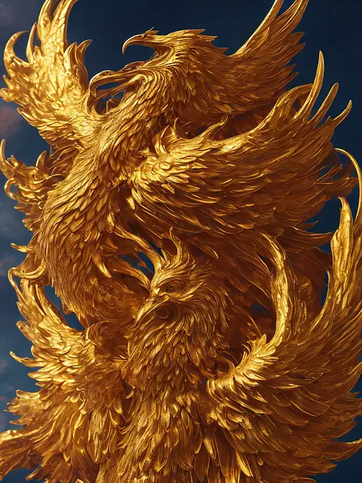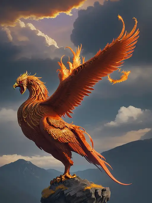 2 years ago A majestic phoenix with vibrant plumage, its fiery wings spread wide, golden feathers illuminating against a dark sky, perched atop a rugged mountain peak, surrounded by swirling clouds, capturing the phoenix's grace and intensity, Sculpture, bronze casting, 8k high definition --ar 1:1 --v 5 cr4shband1coot 1 110