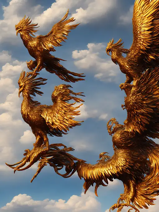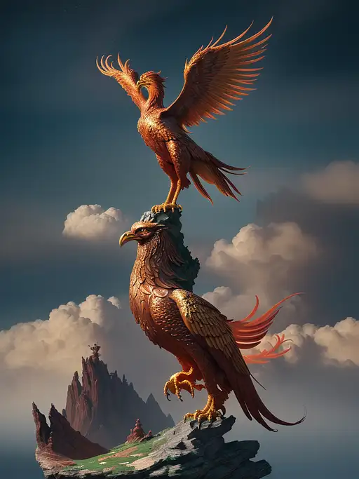 2 years ago A majestic phoenix with vibrant plumage, its fiery wings spread wide, golden feathers illuminating against a dark sky, perched atop a rugged mountain peak, surrounded by swirling clouds, capturing the phoenix's grace and intensity, Sculpture, bronze casting, 8k high definition --ar 1:1 --v 5 cr4shband1coot 0 57