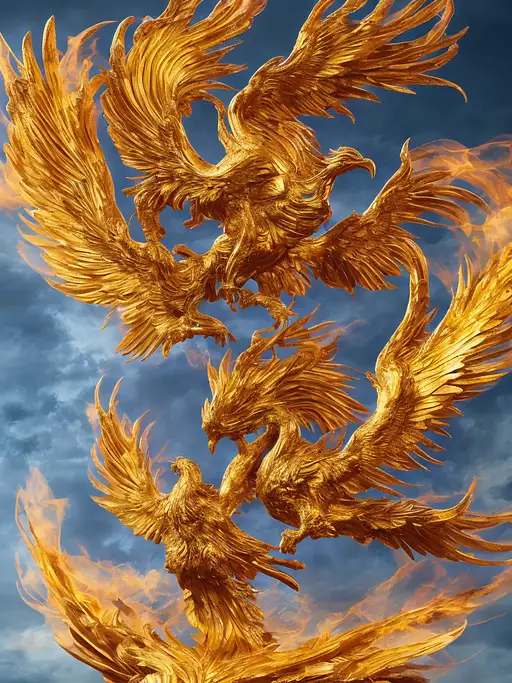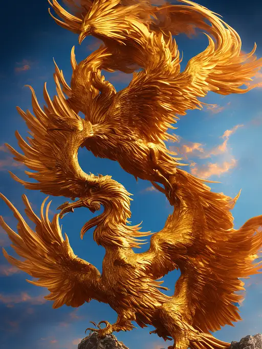 2 years ago A majestic phoenix with vibrant plumage, its fiery wings spread wide, golden feathers illuminating against a dark sky, perched atop a rugged mountain peak, surrounded by swirling clouds, capturing the phoenix's grace and intensity, Sculpture, bronze casting, 8k high definition --ar 1:1 --v 5 cr4shband1coot 0 48