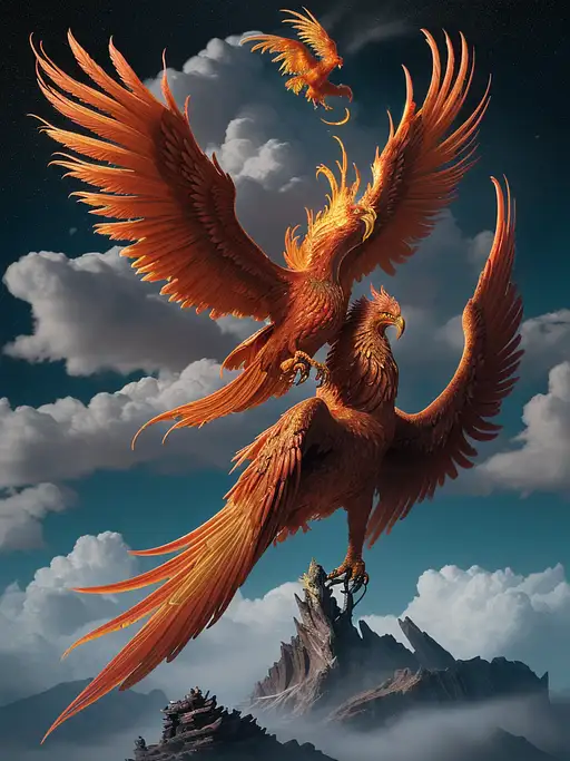 2 years ago A majestic phoenix with vibrant plumage, its fiery wings spread wide, golden feathers illuminating against a dark sky, perched atop a rugged mountain peak, surrounded by swirling clouds, capturing the phoenix's grace and intensity, Sculpture, bronze casting, 8k high definition --ar 1:1 --v 5 cr4shband1coot 0 54