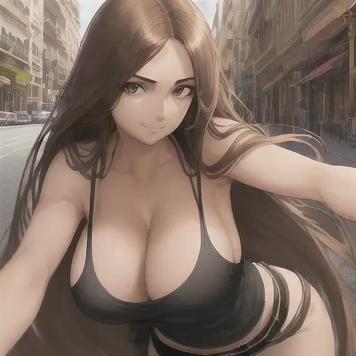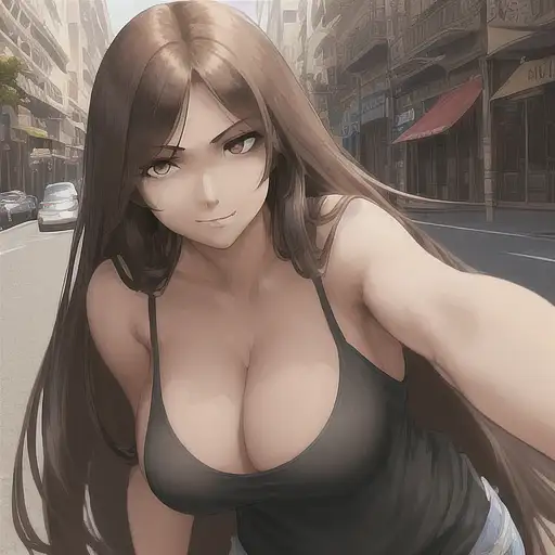 over 2 years ago a woman, long brown hair, beautiful face, black spaghetti strap tank top, beautiful eyes, super huge bust, cleavage, street setting, super realism, 8k, slight smile, bending down d097dcc06ac 0 23
