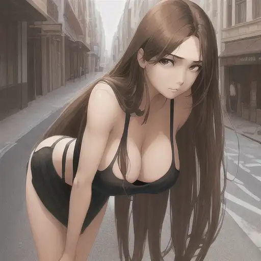 over 2 years ago a woman, long brown hair, beautiful face, black spaghetti strap tank top, big bust, cleavage, street setting, super realism, 8k, slightly bending down d097dcc06ac 0 21