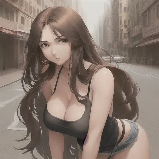 over 2 years ago a woman, long brown hair, beautiful face, black spaghetti strap tank top, big bust, cleavage, street setting, super realism, 8k, slightly bending down d097dcc06ac 0 25